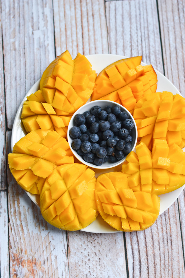 I’ve been slightly brainwashed by the raw foodists on the internet and have really made it a focus to eat as many plant-based carbohydrates (mostly fruit) as I can everyday for improved health. So far the higher carb lifestyle is working great for me! I’ve noticed improved digestion and a leaner physique (which I hope is also due to the fact that I’ve been exercising on the Bikini Series). I have given up my oatmeal for now (gasp!) and turned to 100% fruit breakfasts. I usually alternate between smoothies or a fruit platter/salad. This was my breakfast yesterday! Four mangoes and about 2/3 c. of local blueberries.